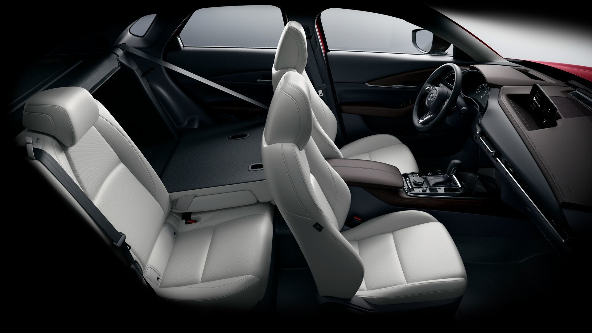 The interior contrast in the GT Kuro Turbo is deliberate and distinct from anything else in the 2026 CX-30 range. Kuro-exclusive white leatherette seats with grey Leganu fabric inserts, light grey stitching, and Grey Leganu interior trim create a bright, open cabin feel that sits in clear visual contrast to the dark exterior accents. This is the opposite of a conventional blacked-out performance interior — the design logic pairs the dark exterior with a lighter, more airy cabin.